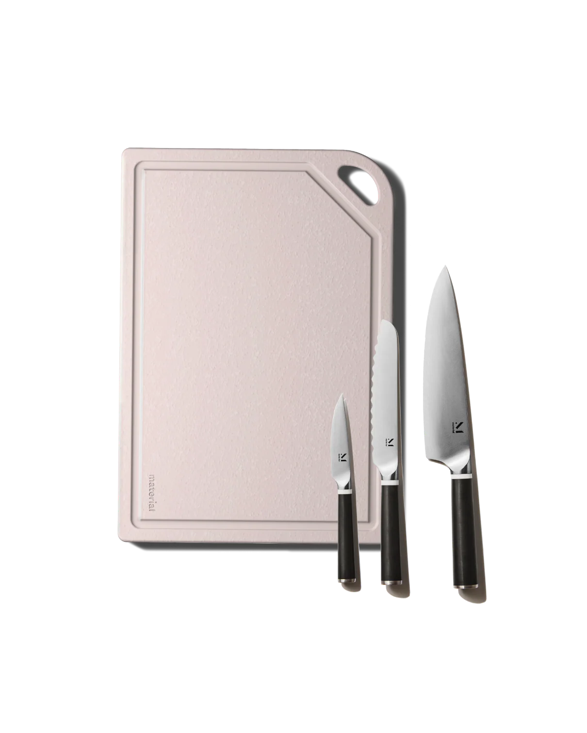 Chop, slice and dice with confidence. The foundation of any kitchen: the right cutting board and a sharp knife. The Good Prep Set has you covered with our 100% plant-based cutting board (free of permanent micro-plastics, non-porous and dishwasher-safe) and our trio of three essential knives, including a perfectly balanced steel 8" chef's knife, 6" serrated knife and almost 4" paring knife.